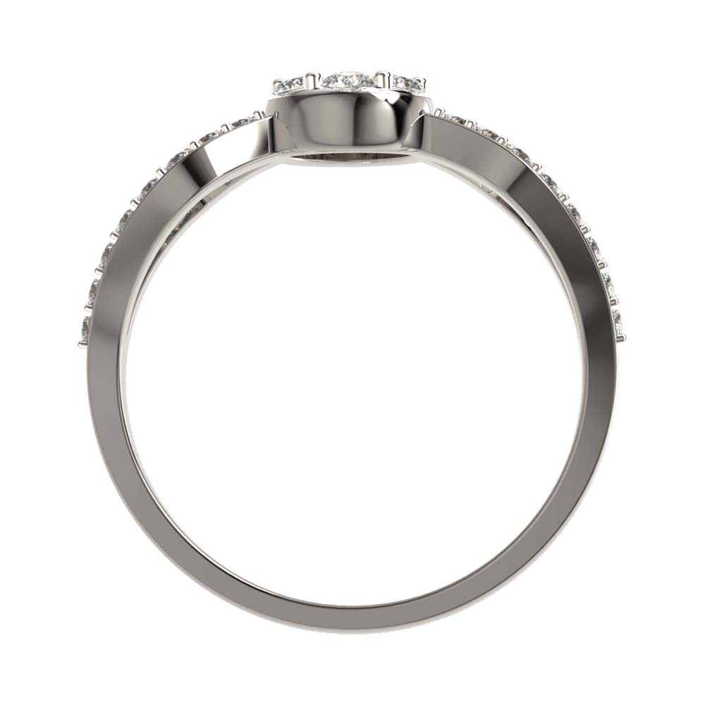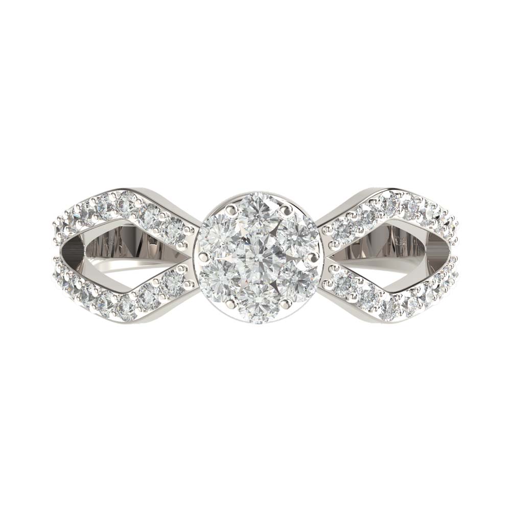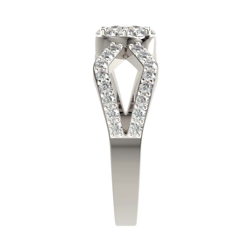 A seamless deign of brilliantly shining diamonds set in a cluster and opening into a split band on either side
